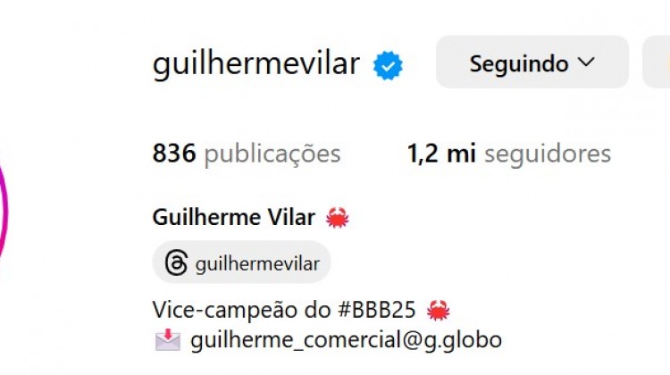 Antes de ser anunciado como participante do BBB 25, Guilherme tinha pouco mais de mil seguidores no Instagram. Um mês após o início do confinamento, o fisioterapeuta de Pernambuco atingiu a mais de 264 mil pessoas.